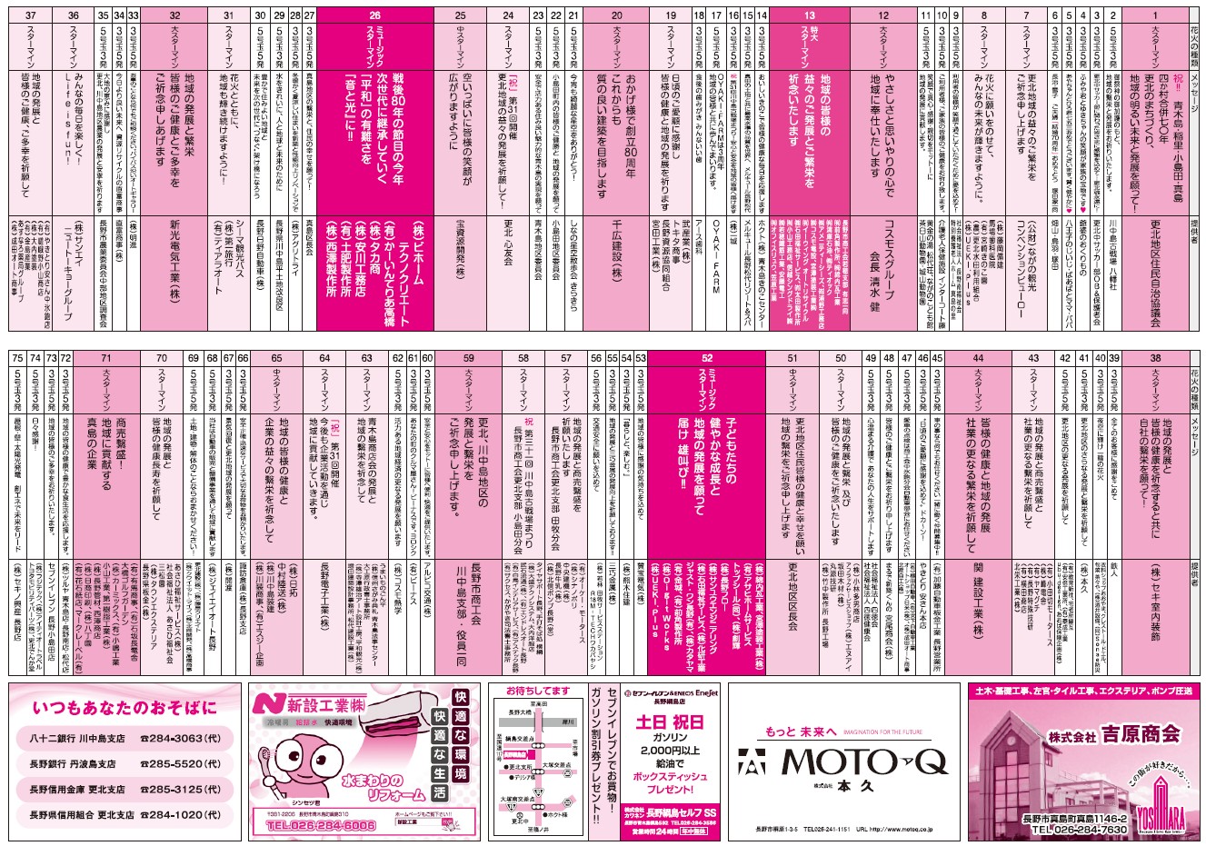 地域の振興と将来を担う子供たちの夢と郷土の思い出を与え、川中島の戦いでなくなった人々の御霊に追悼の意を捧げるために開催される長野県長野市更北地域の祭りです。大スターマインやミュージックスターマインなど約3000発の花火が打ち上げられます。