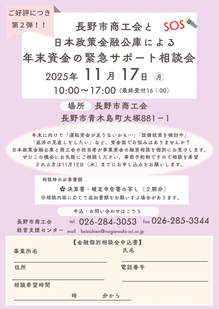 長野市商工会では日本政策金融公庫と共催で事業資金に関する個別相談会を開催いたします。